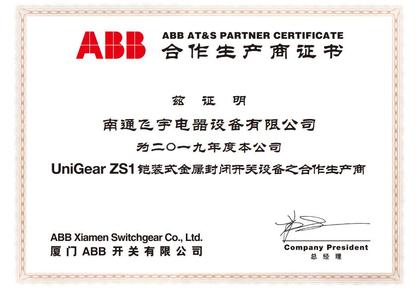 南通飞宇公司荣获厦门ABB开关有限公司合作生产商证书2019-08-27 11:23:17 浏览:1167